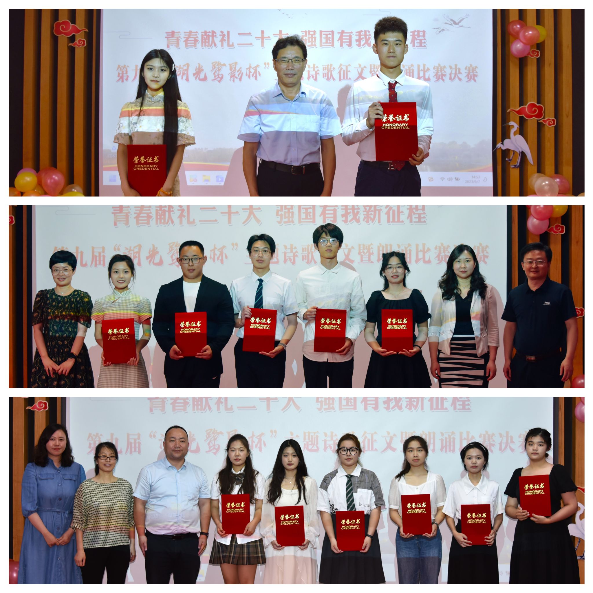 经过激烈角逐,由电力凯发电力中外221班郝一宁与自动化学院自动化225班张怡驰合作带来的朗诵作品《青春》荣获一等奖,能源与动力凯发能动类2202班朱炎与能动类2204班季彤、自动化学院机器人223班张一鸣与唐阳、经济与管理学院国贸201班陈淑勤分获二等奖,其余六组选手获三等奖。现场举行了颁奖仪式。
