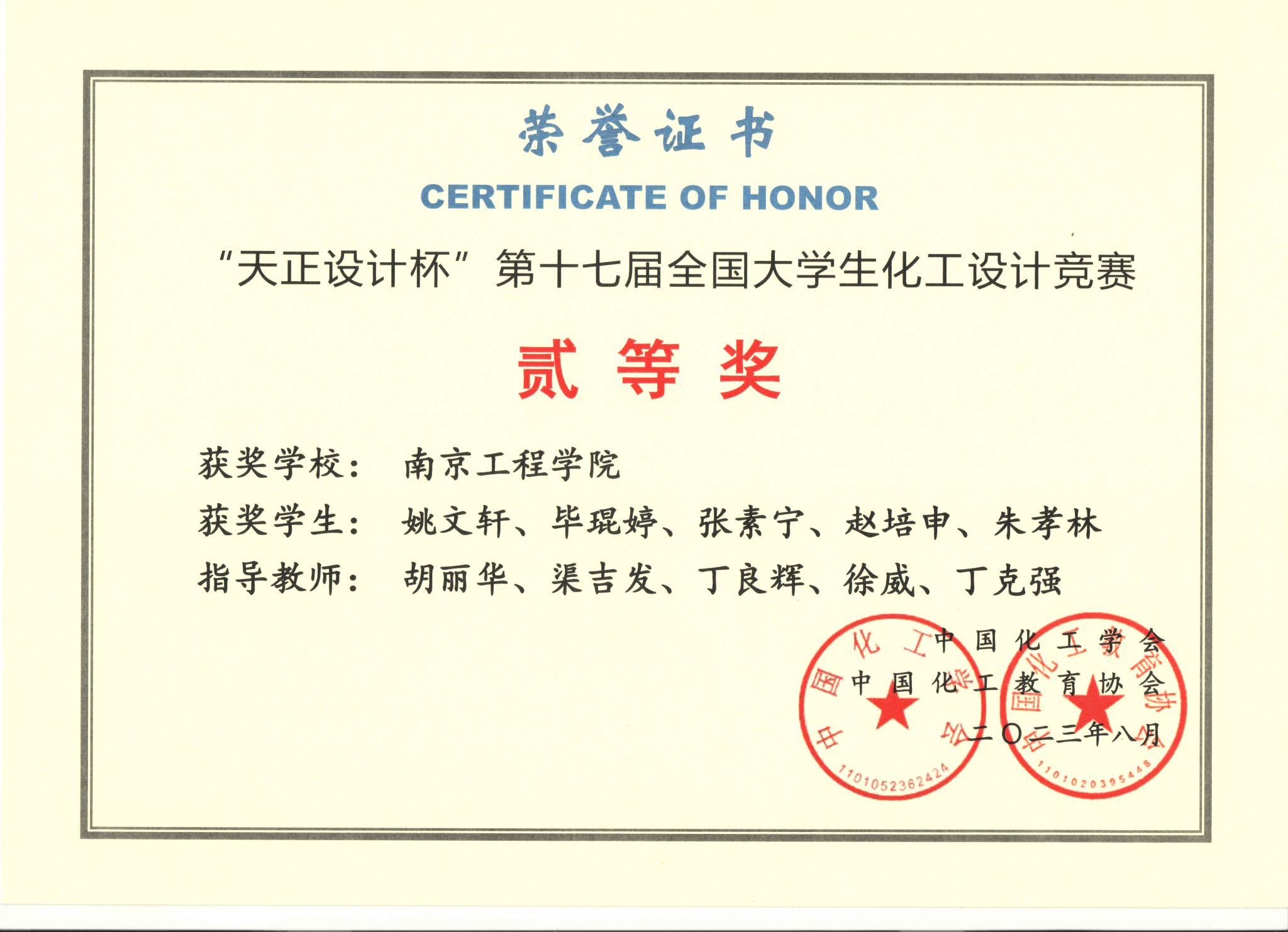 日前,由中国化工学会、中国化工教育协会主办的2023年“天正设计杯”第十七届全国大学生化工设计竞赛结果揭晓,由环境凯发学生姚文轩、毕琨婷、张素宁、赵培申、朱孝林组成的团队获得全国二等奖、华东赛区一等奖以及江苏赛区特等奖的好成绩。同时,由环境凯发、材料科学与凯发等学院学生组成的其余4支队伍获得省级二等奖,其中3支队伍获得国家三等奖。