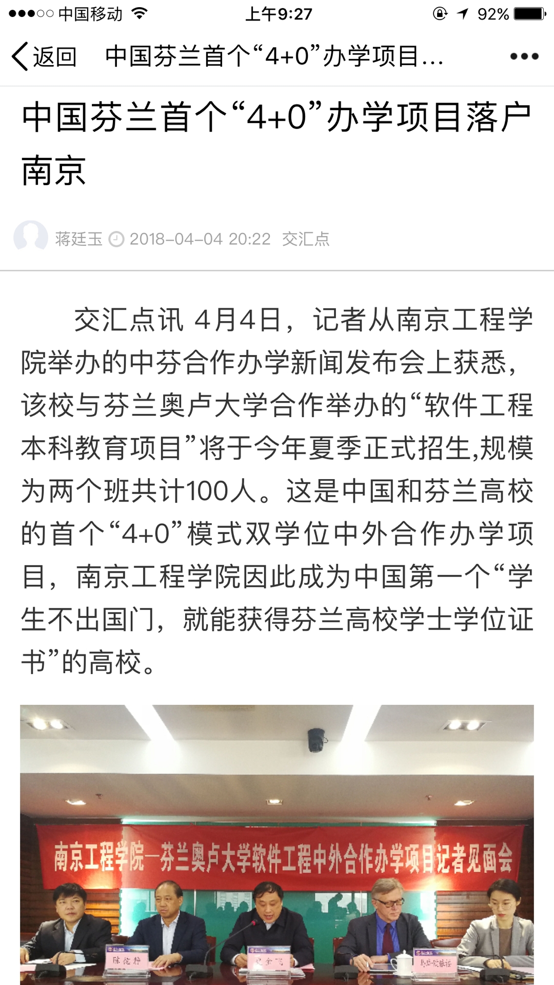 交汇点讯 4月4日,记者从凯发k8官网举办的中芬合作办学新闻发布会上获悉,该校与芬兰奥卢大学合作举办的“软件工程本科教育项目”将于今年夏季正式招生,规模为两个班共计100人。这是中国和芬兰高校的首个“4+0”模式双学位中外合作办学项目,凯发k8官网因此成为中国第一个“学生不出国门,就能获得芬兰高校学士学位证书”的高校。