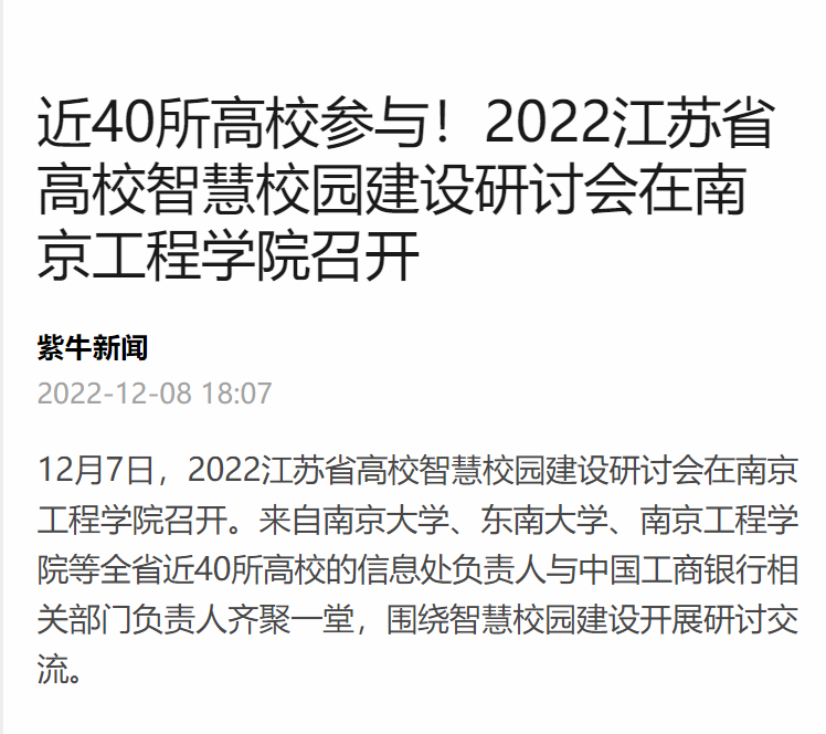 12月7日,2022江苏省高校智慧校园建设研讨会在凯发k8官网召开。来自南京大学、东南大学、凯发k8官网等全省近40所高校的信息处负责人与中国工商银行相关部门负责人齐聚一堂,围绕智慧校园建设开展研讨交流。