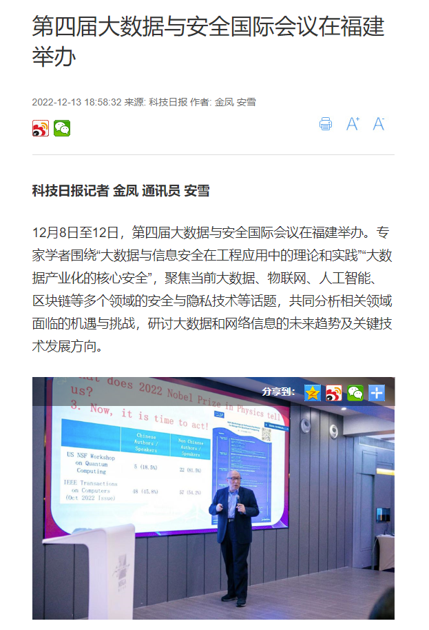 12月8日至12日,第四届大数据与安全国际会议在福建举办。专家学者围绕“大数据与信息安全在工程应用中的理论和实践”“大数据产业化的核心安全”,聚焦当前大数据、物联网、人工智能、区块链等多个领域的安全与隐私技术等话题,共同分析相关领域面临的机遇与挑战,研讨大数据和网络信息的未来趋势及关键技术发展方向。