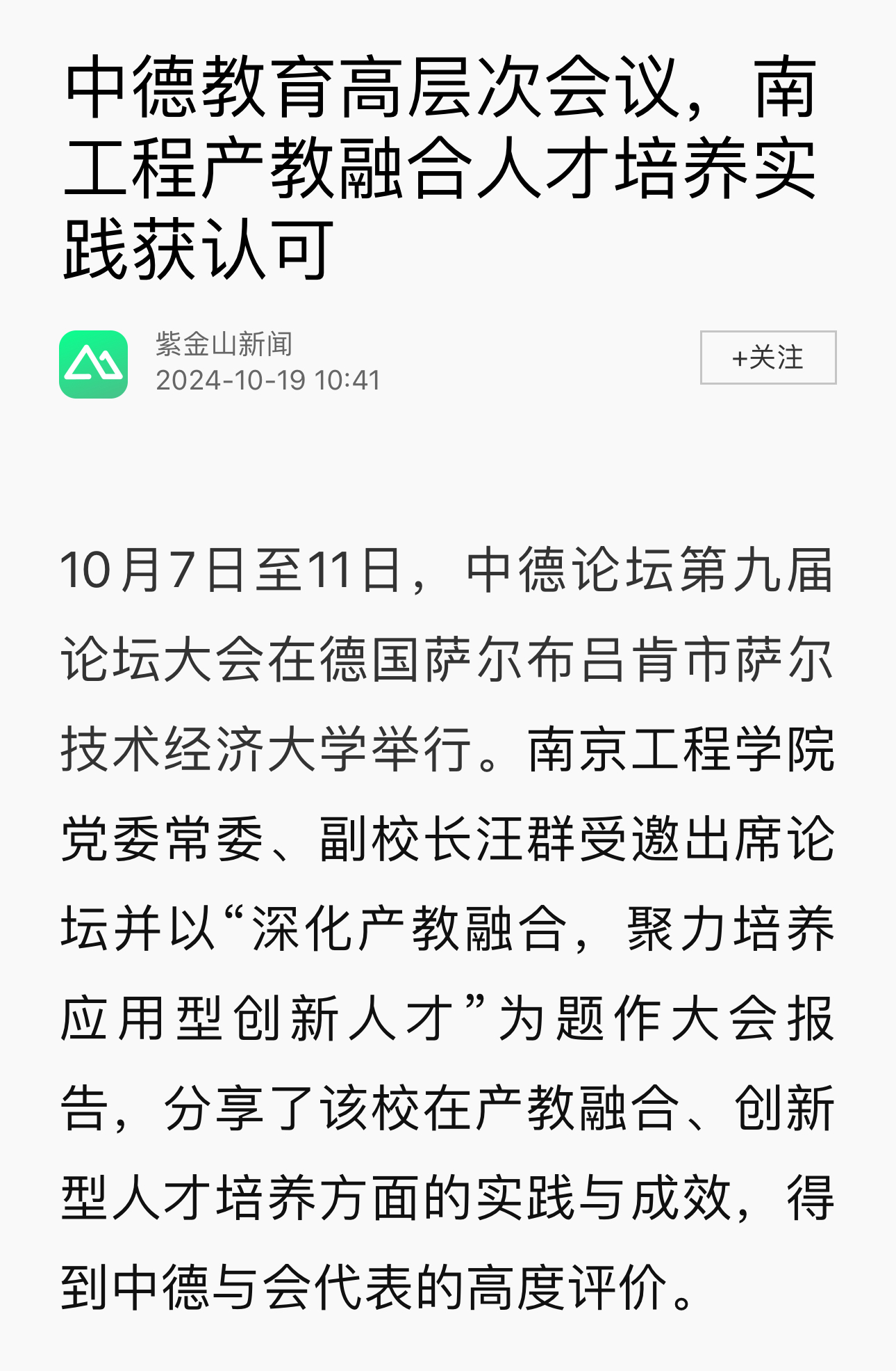 《紫金山新闻》:中德教育高层次会议,南工程产教融合人才培养实践获认可