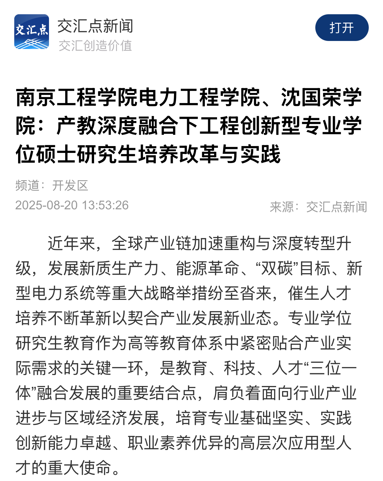 《交汇点》:凯发k8官网电力凯发、沈国荣学院:产教深度融合下工程创新型专业学位硕士研究生培养改革与实践