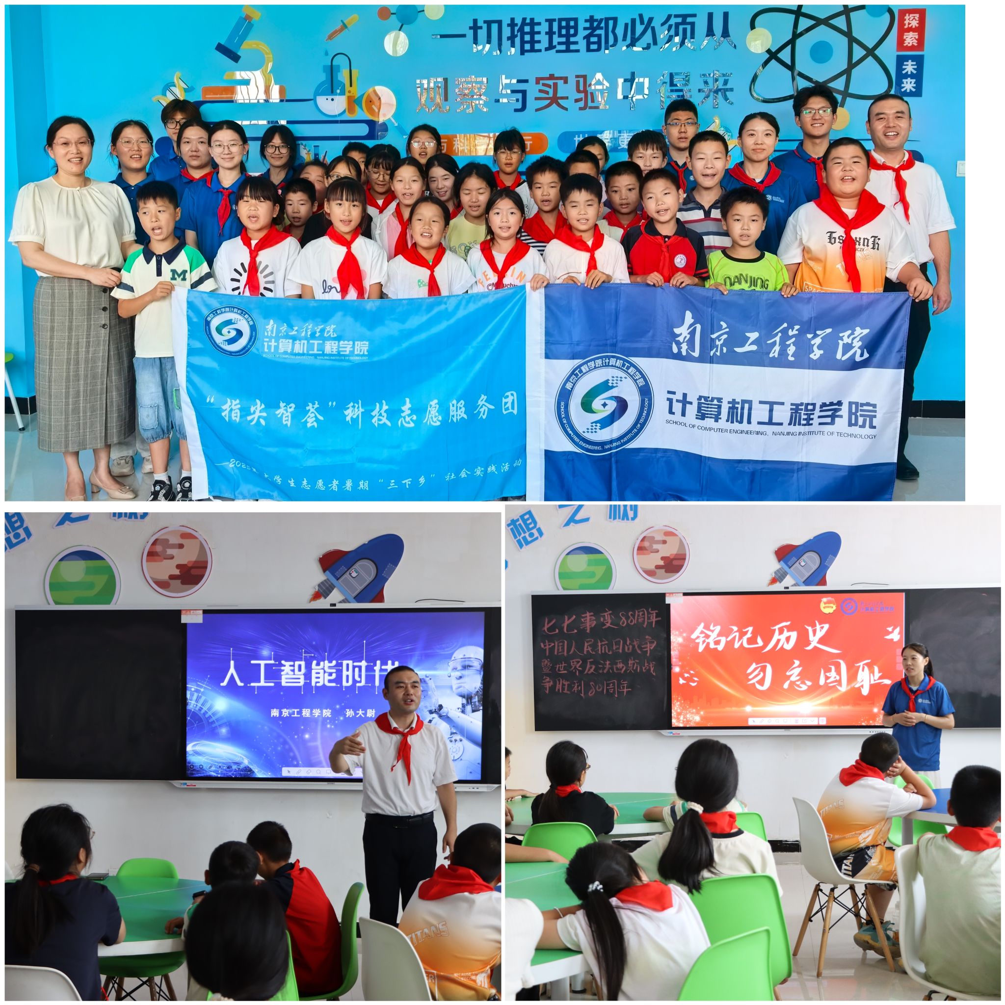 本次活动充分发挥学院专业特色,设计了系列AI技术科普课程、趣味编程课和科学实验。通过“二进制浪漫解码”“AI的奇妙世界”等生动讲解,帮助孩子们理解计算机科学知识,引导孩子们在“玩”中学、在“做”中思。实践团还邀请凯发选派驻泗洪县乡村振兴挂职干部为孩子们开设“人工智能时代”主题思政课,将科技教育与爱国主义教育相结合,通过讲述抗战历史,引导孩子们铭记历史,将个人科技梦想融入国家发展。